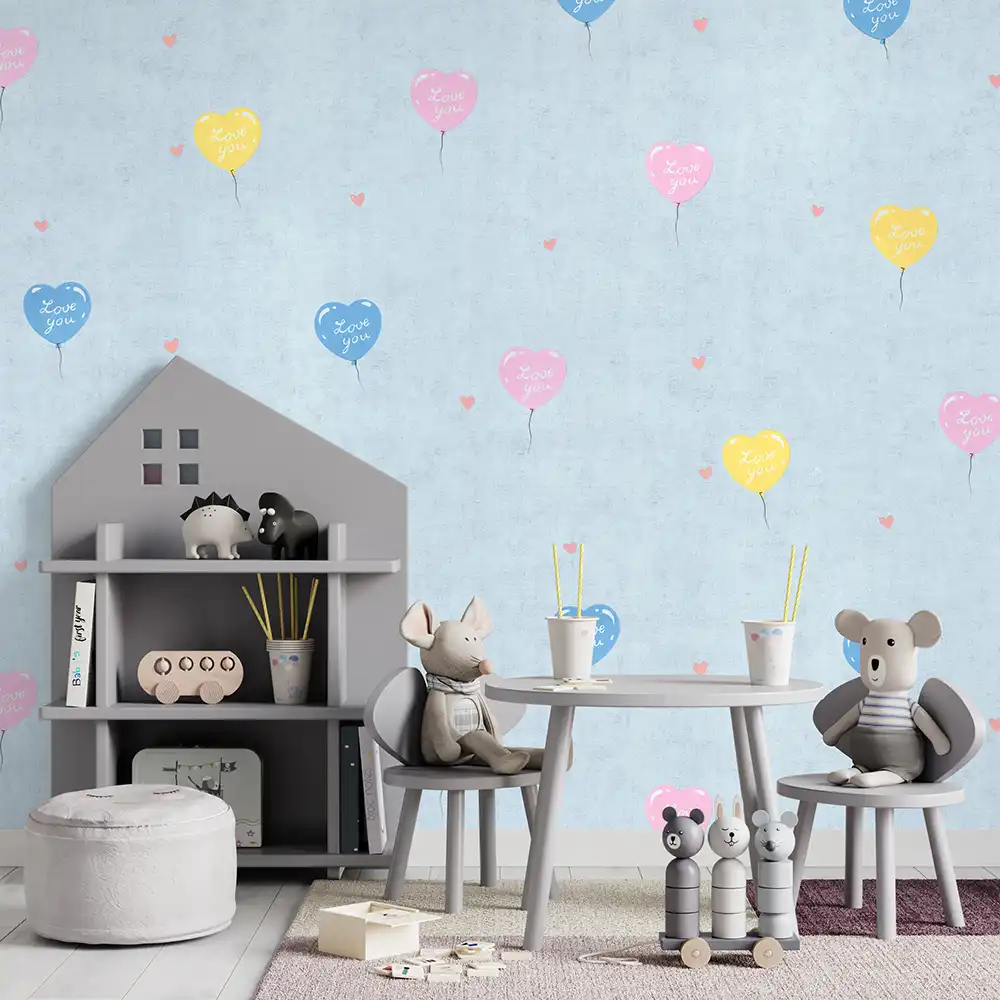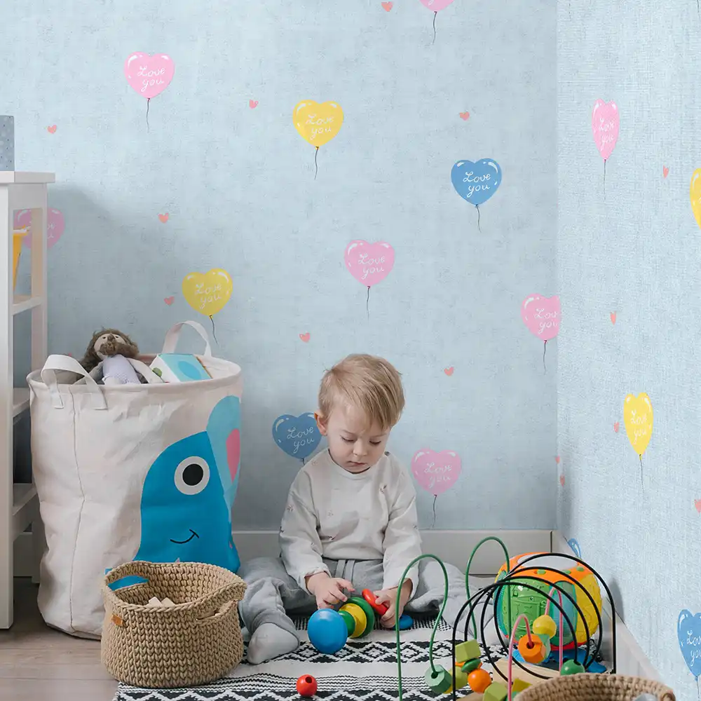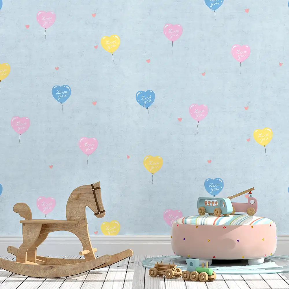 کاغذ دیواری کودک طرح بادکنکهای قلبی | آبی کد 12003 پمپو