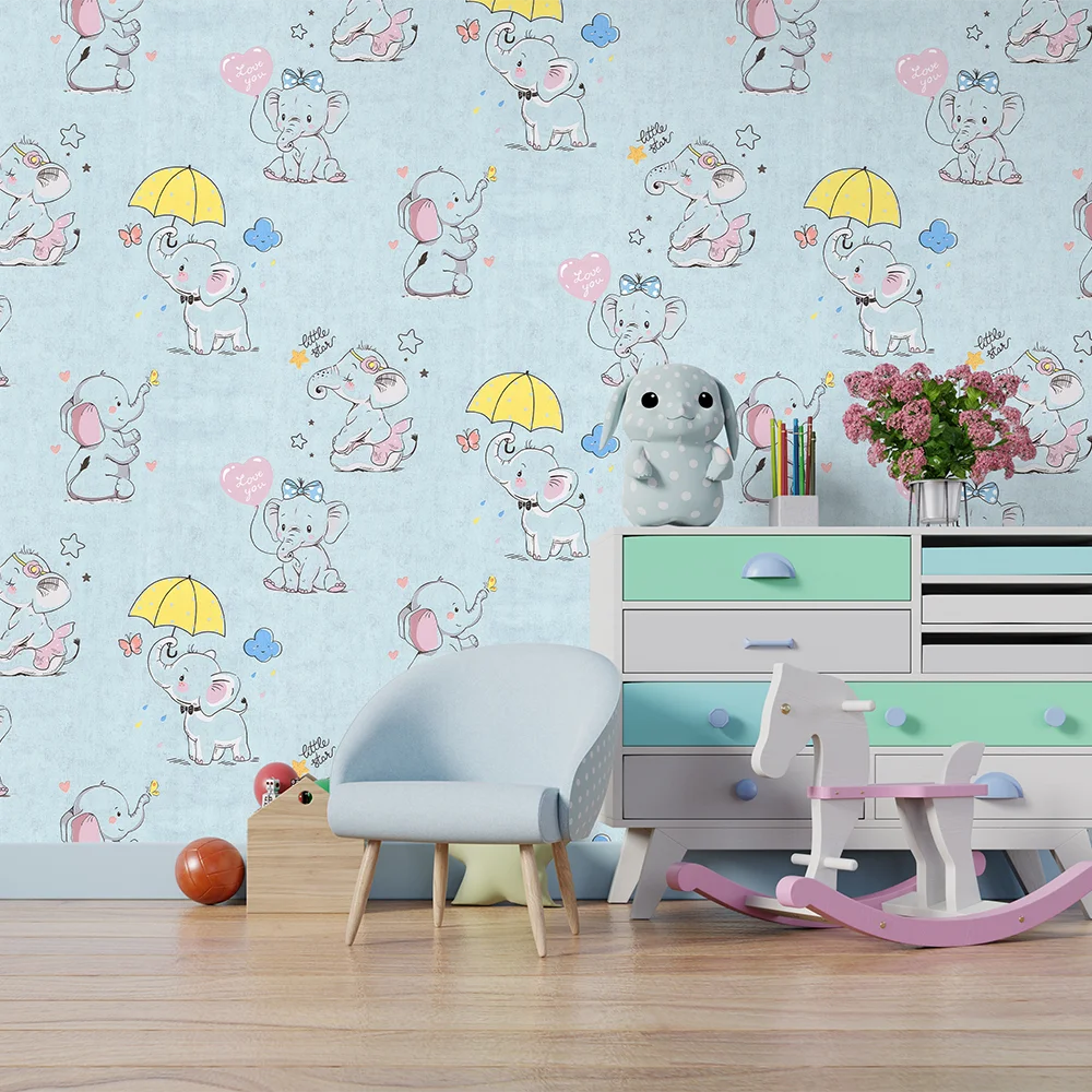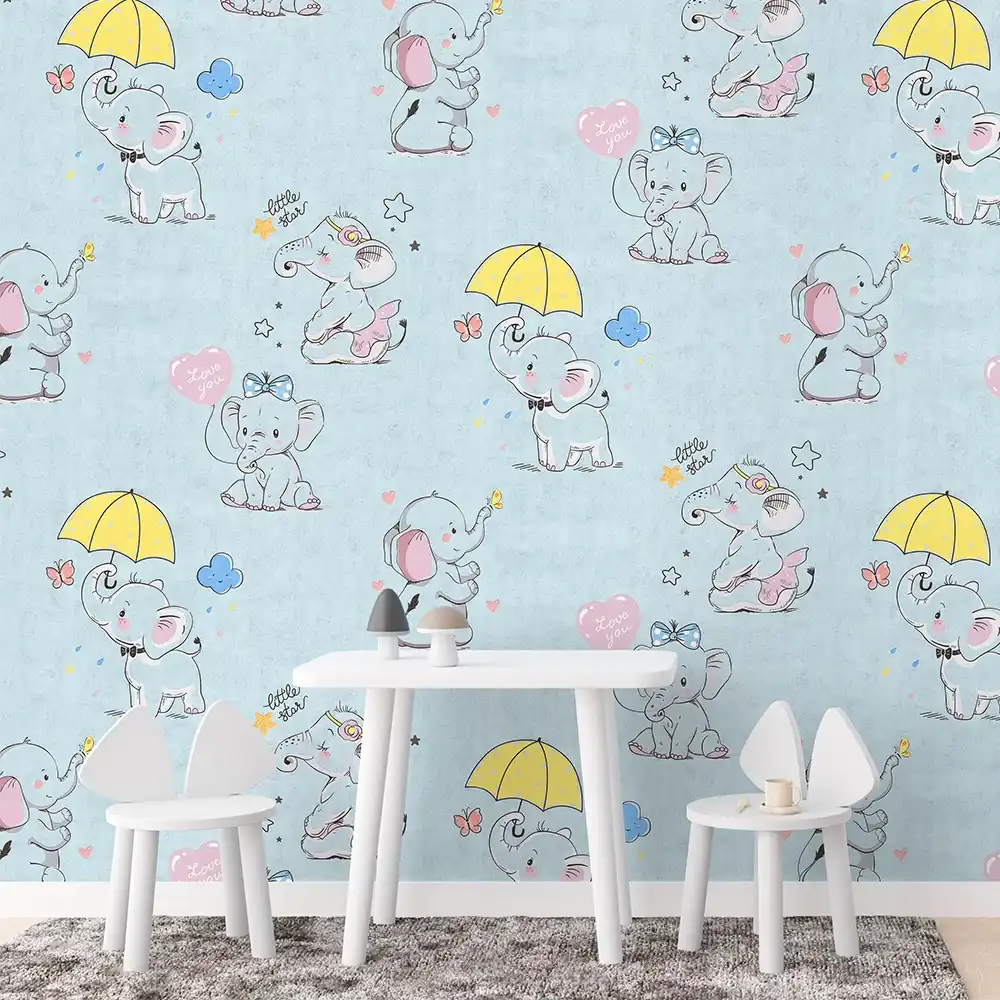 کاغذ دیواری کودک طرح فیل کوچولوها | آبی کد 12001 پمپو
